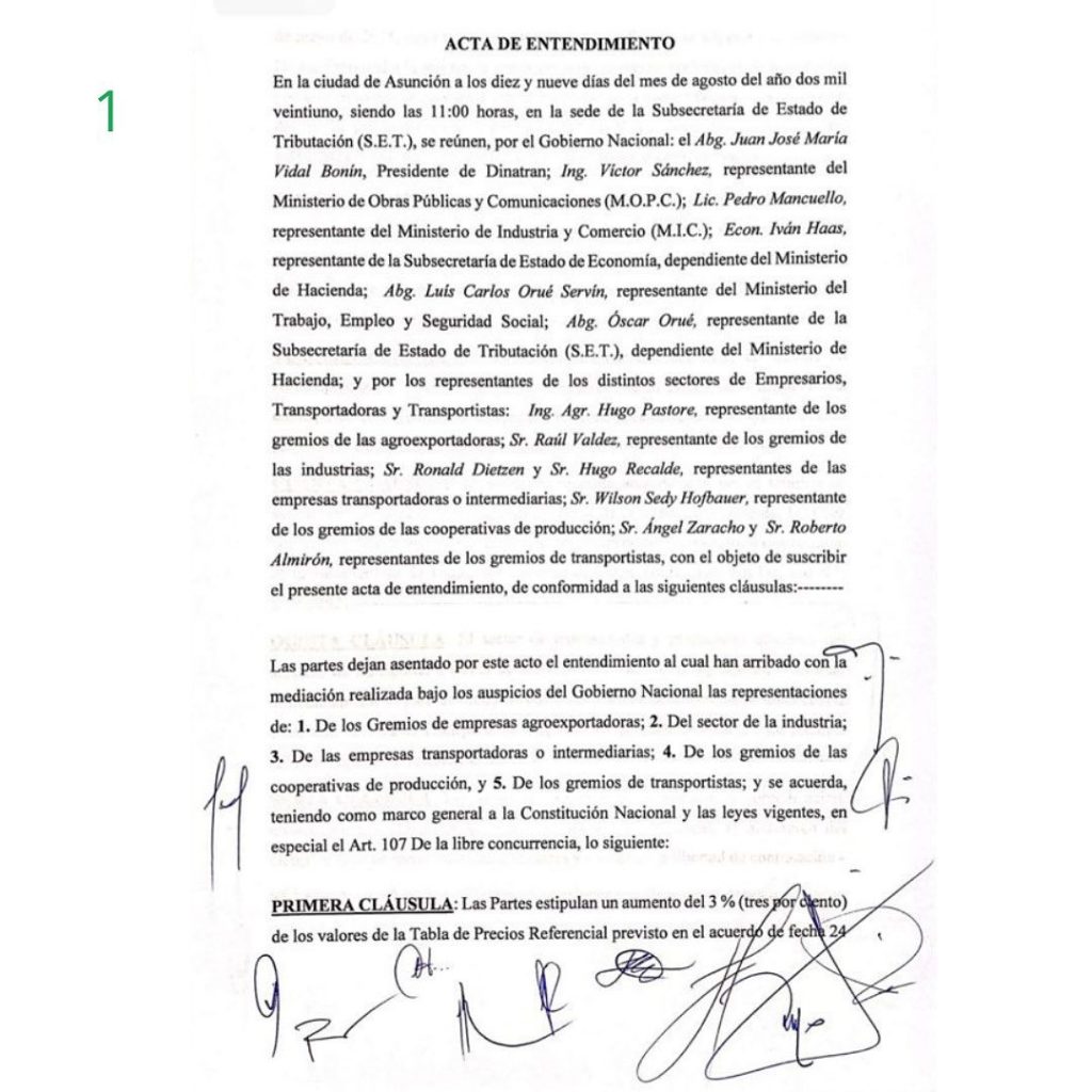 El sector productivo y gremios de camioneros firmaron un acta de entendimiento operativo para poder avanzar en las negociaciones respecto a los costos del servicio de flete, esto gracias a la mediación del Gobierno el pasado 19 de agosto y dio pie para el levantamiento de las medidas de fuerza implementada por los camioneros.