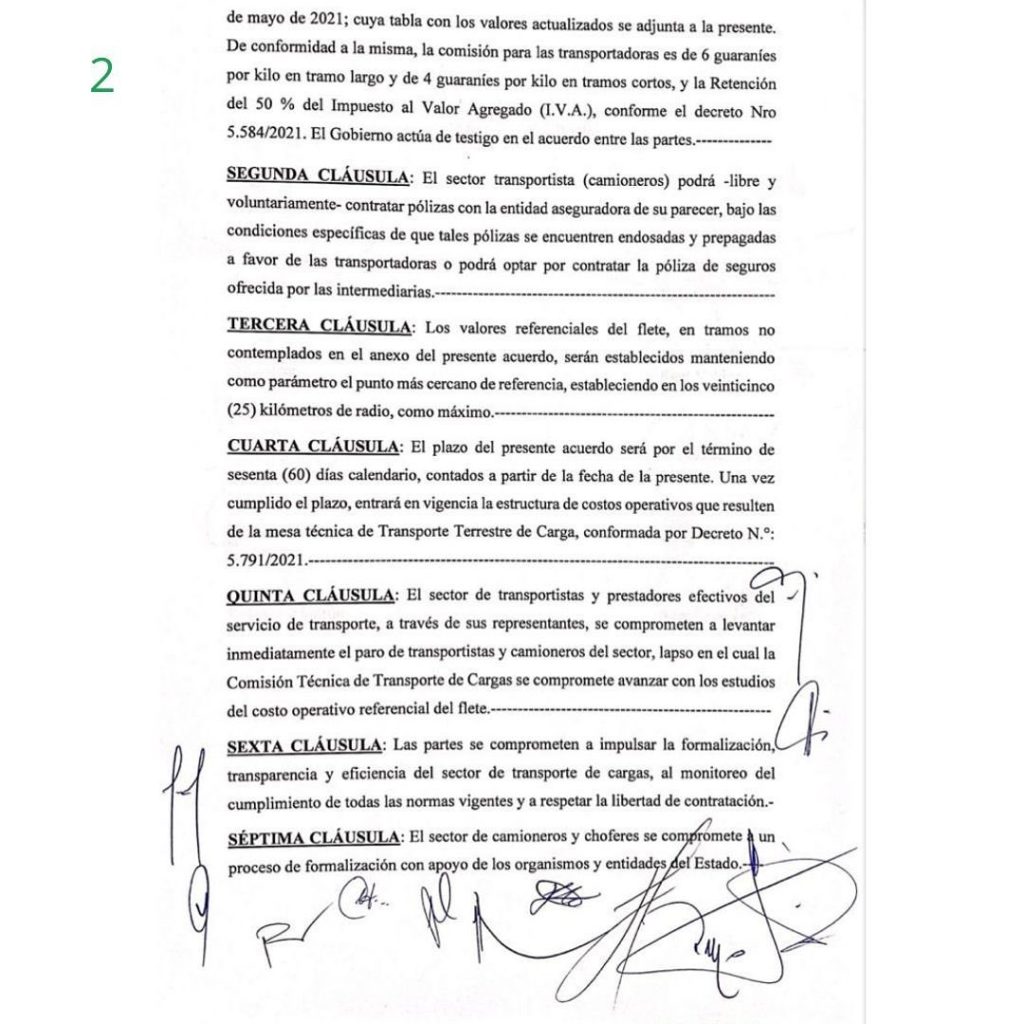Dicho documento busca definir un costo mínimo operativo del servicio de fletes, base sobre la cual las partes negociarán los precios finales del transporte de carga. Este acuerdo es de carácter provisorio, para los próximos 60 días a partir de la fecha, mientras el comité mantenga sus reuniones y se hagan los estudios técnicos correspondientes.