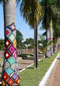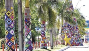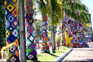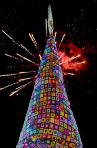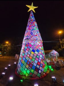 Nada menos que 25 artesanas unieron fuerzas para hacer el llamativo arbolito, sumando 3.000 grannys. La obra, que tiene de 10 metros de altura y 12 metros de diámetro, resalta el talento local, además de resaltar y fortalecer los lazos comunitarios. Coloridos adornos haciendo juego engalanan los alrededores.