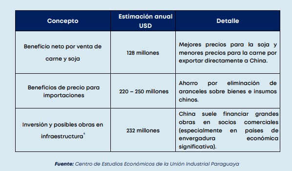 Indica que de estos cuatro productos, Paraguay podría vender especialmente dos a China: carne y soja. Suponiendo un escenario donde toda la carne bovina paraguaya vendida a Taiwán, Argentina, Brasil y Uruguay, pasa a venderse a China, los resultados serían los siguientes, según la CEE: