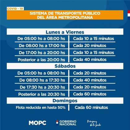 Filadelfia,RCC.- El viceministro de Transporte, Pedro Britos, detalló por medio de su cuenta oficial de Twitter que tras la disposición del Poder Ejecutivo de ampliar la cuarentena hasta el 19 de abril próximo se establecieron nuevos horarios para la circulación de los buses del transporte público.