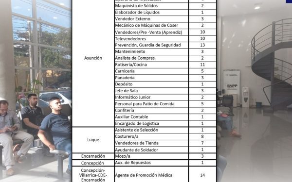 Entre los 149 trabajadores que solicitan esta semana figuran 30 vendedores pre-pago para telefonía, 10 vendedores pre-venta, televendedores y siete vendedores de tienda. Además requieren guardias de seguridad, costureros, informático junior, personal para patio de comida, mozo, ayudante de soldador, entre varios otros puestos de trabajo.