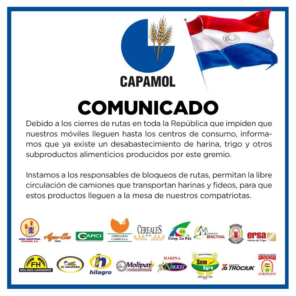 «Instamos a los responsables de bloqueos de rutas, permitan la circulación de camiones que transportan harinas y fideos, para que estos productos lleguen a la mesa de nuestros compatriotas», expresaron mediante un comunicado emitido a través de redes sociales.
