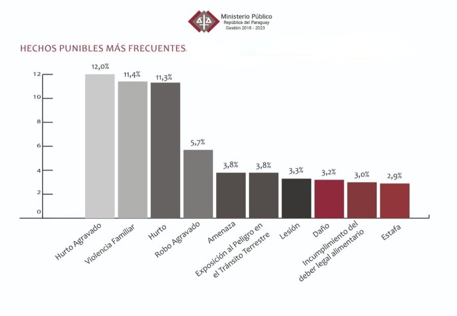 El hecho punible más denunciado es el Hurto Agravado con el 12% de las causas abiertas, seguido por el Violencia Familiar con 11.4% y Hurto con 11.3%.