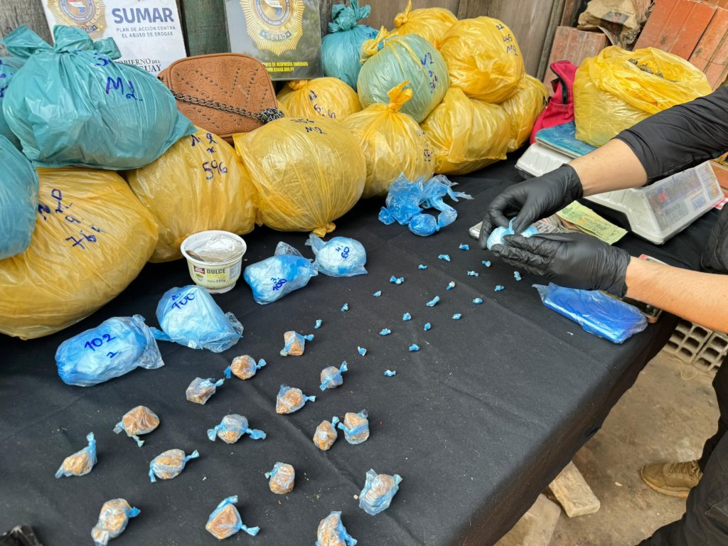 Durante el allanamiento, los agentes encontraron 10,7 kg de marihuana distribuidos en 23 «pelotas», 442 gramos de clorhidrato de cocaína y 103 gramos de pasta base (chespi), suficientes para más de 500 dosis. Además, se incautaron una motocicleta, varios aparatos celulares, balanzas de precisión y dinero en efectivo en guaraníes y pesos argentinos.