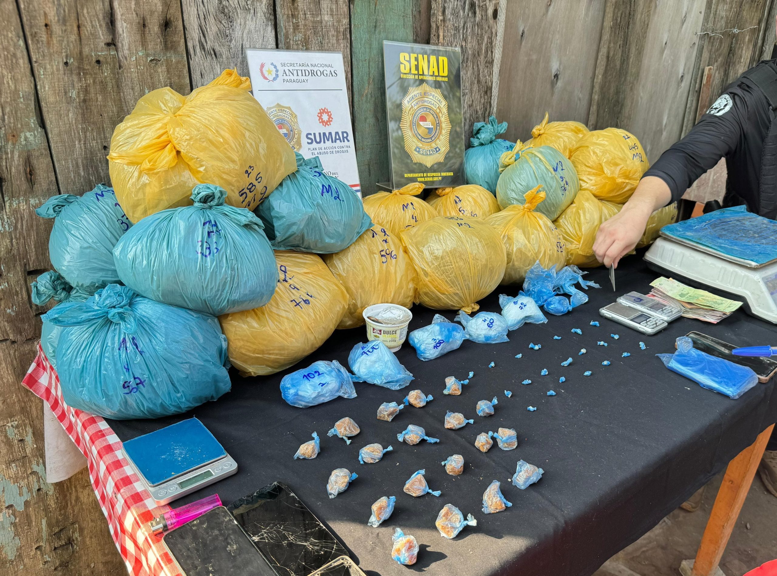 Durante el allanamiento, los agentes encontraron 10,7 kg de marihuana distribuidos en 23 «pelotas», 442 gramos de clorhidrato de cocaína y 103 gramos de pasta base (chespi), suficientes para más de 500 dosis. Además, se incautaron una motocicleta, varios aparatos celulares, balanzas de precisión y dinero en efectivo en guaraníes y pesos argentinos.