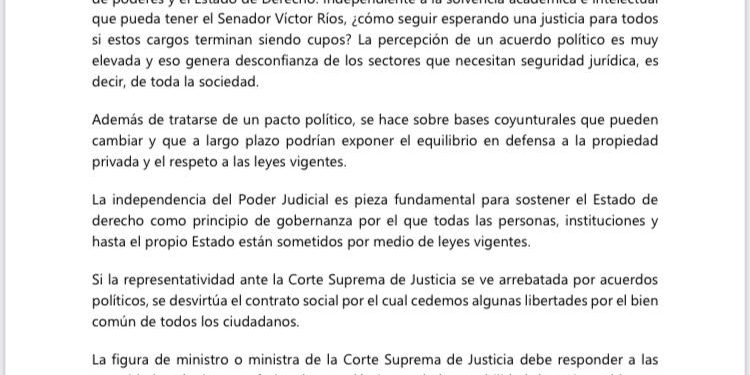 «Si la representatividad ante la Corte Suprema de Justicia se ve arrebatada por acuerdos políticos, se desvirtúa el contrato social por el cual cedemos algunas libertades por el bien común de todos los ciudadanos. La figura de ministro o ministra de la Corte Suprema de Justicia debe responder a las necesidades técnicas, profesionales, académicas y de honorabilidad de su investidura, y esto se pone en duda cuando existen a la vista intereses de sectores determinados», concluyen.