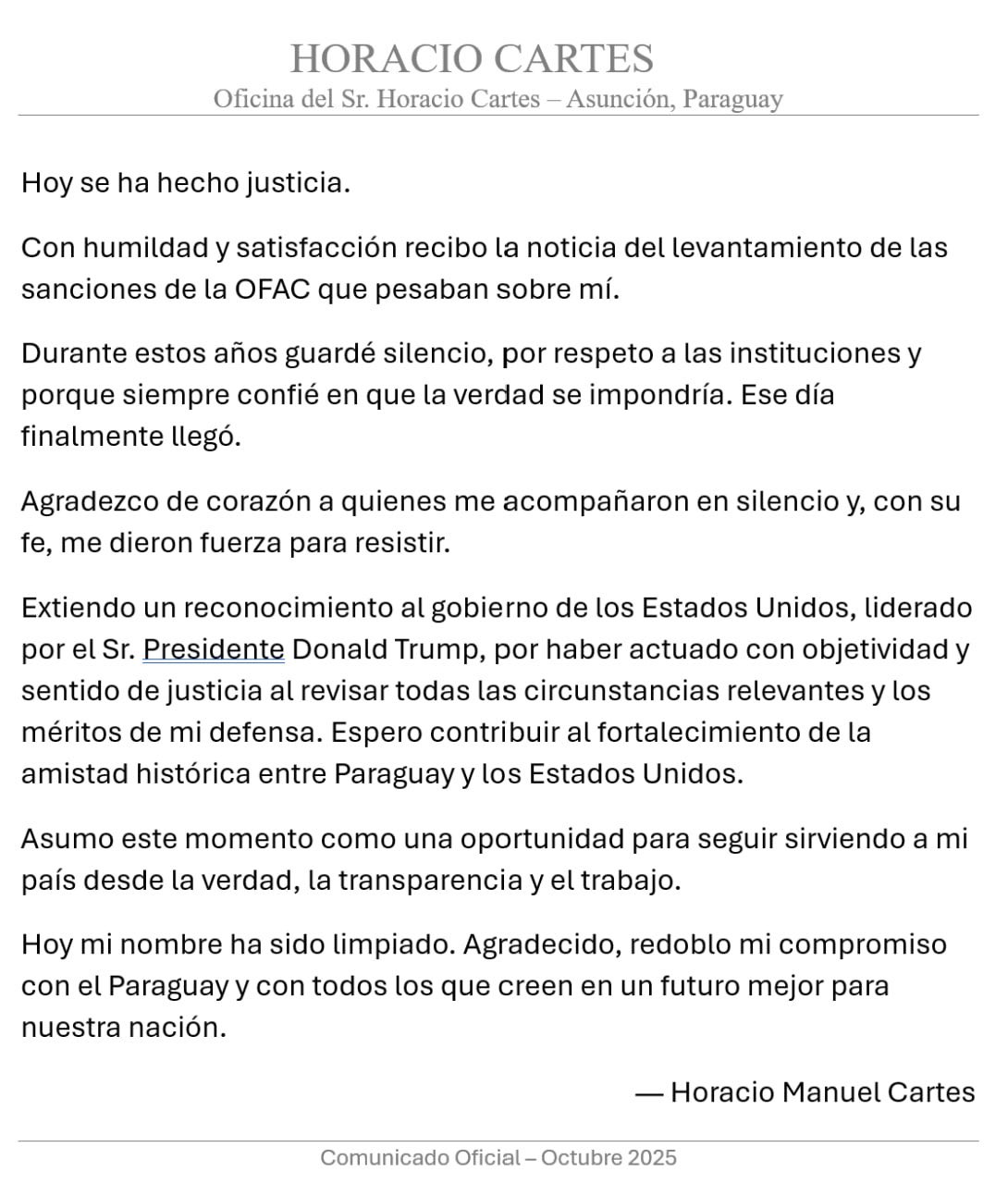 Cartes agradeció a las personas que lo acompañaron durante este proceso, “en el silencio y con su fe”, y que —dijo— le dieron fuerzas para resistir. También reconoció al gobierno del expresidente Donald Trump por haber actuado “con objetividad y sentido de justicia” al revisar su caso, confiando en que esta decisión contribuya a fortalecer “la amistad histórica entre Paraguay y los Estados Unidos”.