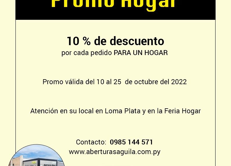 Aberturas Águila complacerá a todos sus clientes en el mes de octubre, ya que a partir del 10 al 25 de dicho mes, ofrecerá descuentos de hasta el 10% por cada pedido para un hogar, para ello, los interesados deberán acercarse en su local de ventas en Loma Plata, así como también, en la gran Feria Hogar 2022, dentro del predio de Pioneros del Chaco.