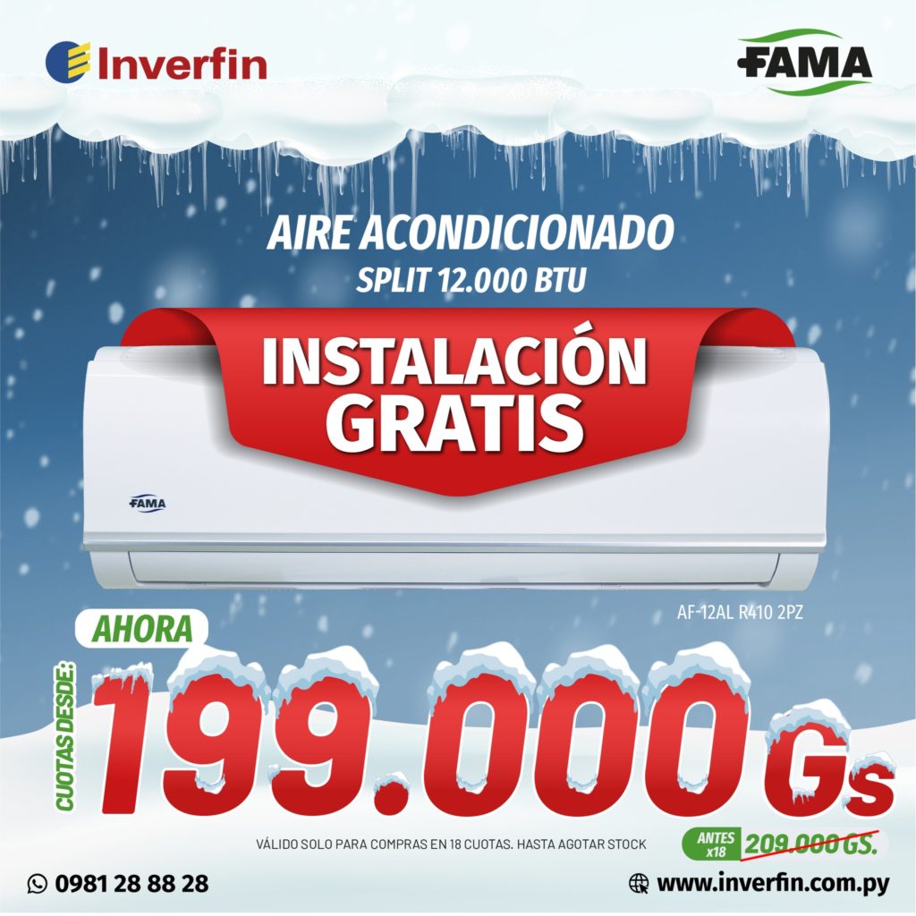 Y si bien ha entrado otra estación del año al país, la sensación veraniega todavía está presente, por ello, Inverfin no quiere que sigas sufriendo los grandes embates del calor y te llama a aprovechar las ofertas únicas de los aires acondicionados FAMA de 12.000 BTU, el cual ya viene con la instalación gratis, a tan solo cuotas de 199.000gs.