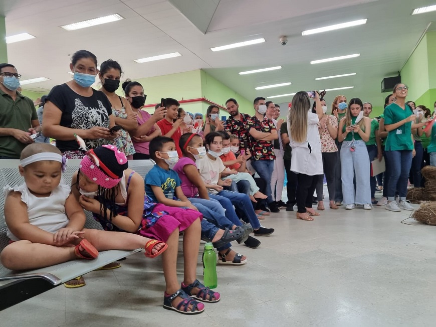 El silencio en la sala de espera del hospital fue interrumpido por las primeras notas musicales que interpretaron los médicos del hospital, cuatro canciones en total: Din Din Don, El Tamborilero, Dos trocitos de Madera y Ven a cantar. Niños y adultos; visitantes y trabajadores del Acosta Ñu, unidos al coro principal acompañaban al coro con cantos, palmas y bailes. Un poco de festividad en el sitio donde muchos niños pasarán el 25 de diciembre.