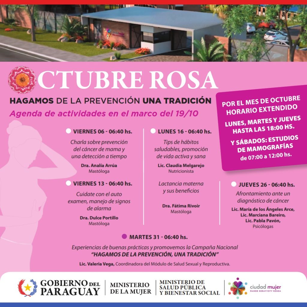 El Centro Ciudad Mujer habilitó el periodo de agendamiento para el estudio de mamografía que contará con un horario extendido a partir del lunes 16 de octubre, los lunes, martes y jueves hasta las 18:00. Asimismo, los días sábados 7, 14, 21 y 28 para estudios de mamografías de 7.00 a 12.00. El estudio es gratuito.