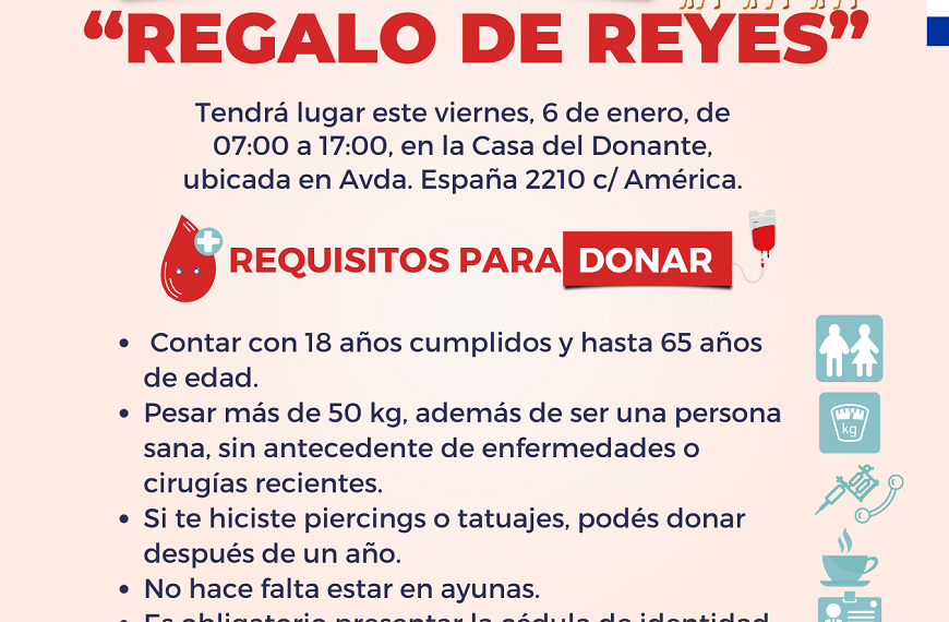 La colecta solidaria de sangre “Regalo de Reyes”, impulsada por el Ministerio de Salud Pública y Bienestar Social, a través del Programa Nacional de Sangre, tiene por objetivo cubrir las necesidades de componentes sanguíneos de los niños internados en los diferentes servicios médicos, así como, instaurar en la ciudadanía, la cultura de la donación voluntaria de sangre.